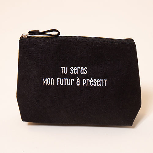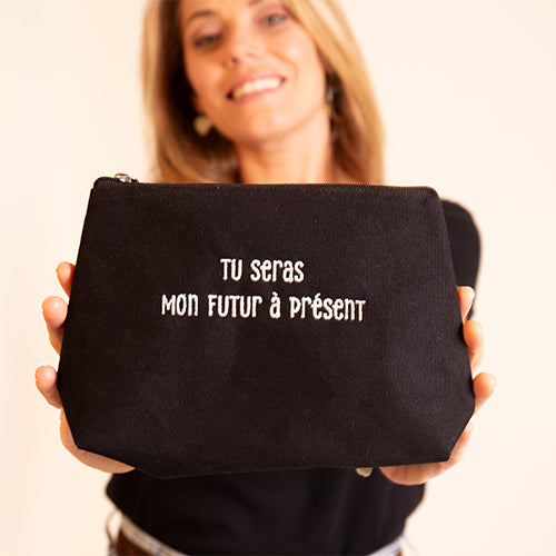Cette trousse de la Collection Tu seras est pensée pour porter un message fort et poétique. Tu seras mon futur à présent, brodé sur le front comme une déclaration d’amour à offrir ou à arborer fièrement. Une pièce unisexe, éco-responsable, labelisée pratique pour le quotidien ou comme trousse de toilette.